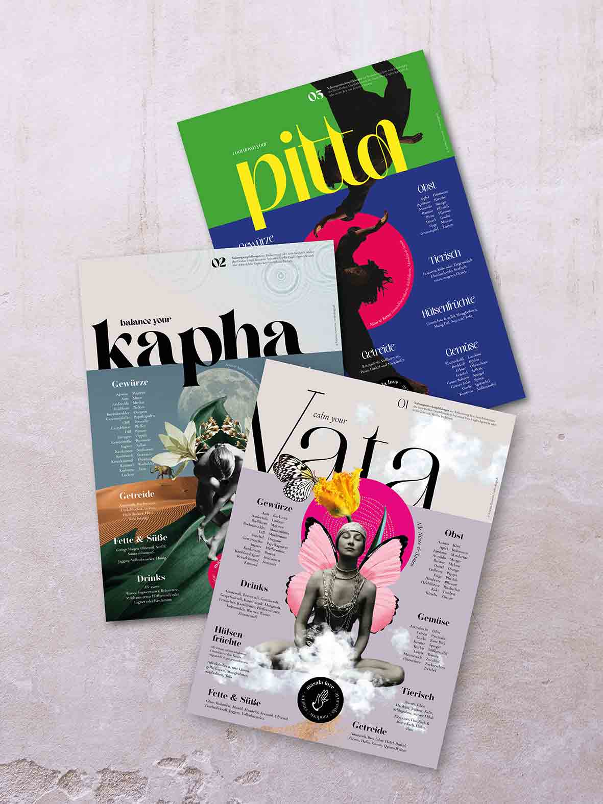 Pitta Ernährung im Sommer, Kapha im Frühling und Vata im Herst und Winter.Mit diesen Plakaten hast du den Überblick! Erhalte alle drei Poster im Wert von zwei!